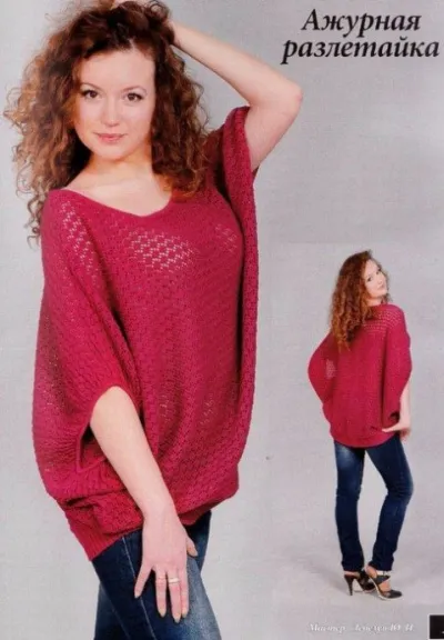 Сборка: выполнить плечевые и боковые швы. По нижнему краю изделия набрать на спицы петли и вязать резинкой 1 на 1. На высоте 7 см от наборного края закрыть все петли. По наборным краям рукавов набрать на спицы петли (в первом ряду равномерно по ширине полотна убавить 60 петель) и вязать лицевой гладью, в высоту выполнить 4 ряда и закрыть все петли, сложить вдвое и пришить с изнаночной стороны. По краю горловины набрать на спицы петли и вязать лицевой гладью, в высоту выполнить 4 ряда, сложить вдвое и пришить с изнаночной стороны.