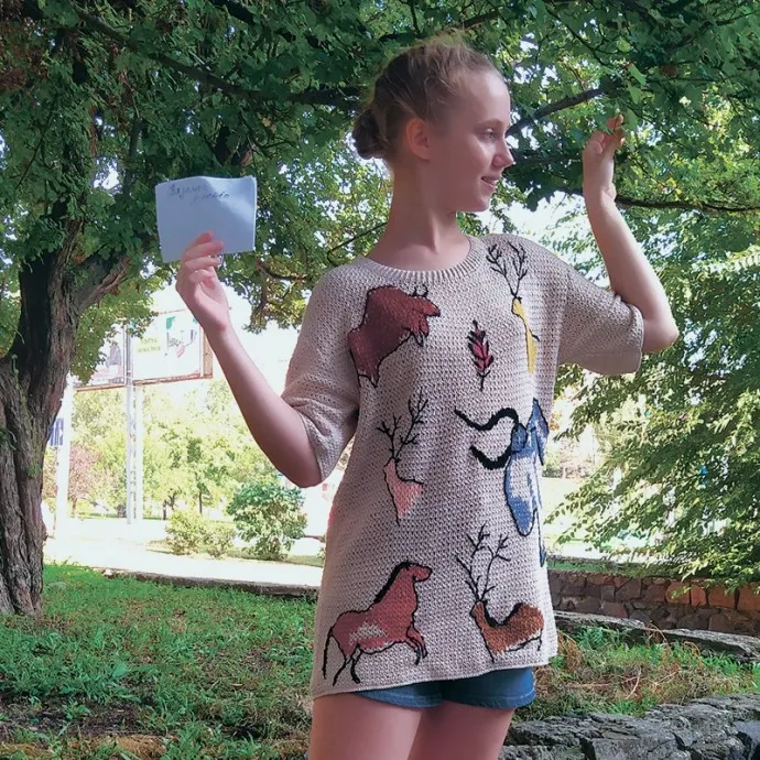 Футболка оверсайз для девочки "Наскальная живопись". Связана крючком из буретного шелка и вышита.