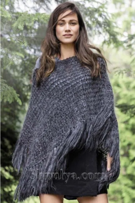 По нижнему краю изделия к каждому 2-му ряду/2-й петле прикрепить бахрому: взять по 3 нити обеих пряж длиной по 40 см, сложить вдвое, за сгиб пропустить с помощью крючка в край изделия, концы протянуть через образовавшуюся петлю и петлю затянуть