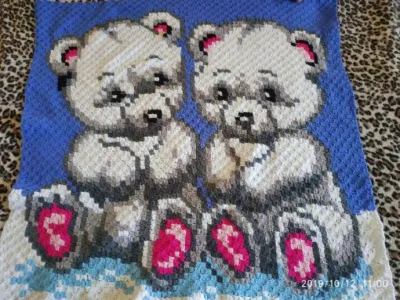 Начну с самой моей любимой работы - плед "Медвежата". В молодости я вышивала такую подушечку, которую подарила ребенку соседки. Вручную перерисовывала схему, которую благополучно потеряла. И вот, гуляя по просторам интернета, наткнулась я на них, срочно-обморочно заказала пряжу. Ожидание пряжи мне показалось вечностью, хотя она шла всего 5 дней. Получила и сразу же начала вязать. Вот что у меня получилось.
