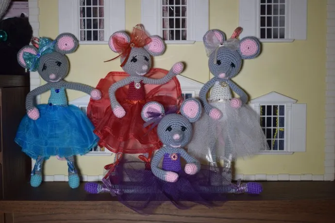 Милые игрушки! Мышки просто превосходны, особенно наряды, яркие, воздушные юбочки — очень красиво! Плюшевые игрушки вне всякой конкуренции, они такие мягкие, нежные, да ещё так мастерски связаны! Фотосессия великолепна, на фоне игрушечного домика все игрушки кажутся ожившими. Браво за такую работу!