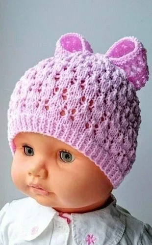 Детская шапочка, связанная ажурной вязкой спицами. Шапочка украшена большим бантом, который связан из той-же пряжи, что и шапка, простым чередованием ажурного узора и платочной вязки. Такой бант украшает детскую шапочку, как спереди, так и сзади. Такой фасон шапочки из-за декора бантом и выбранного цвета пряжи подходит исключительно для девочки. Если Вы хотите связать такую шапку для мальчика, то выберите голубой или зеленый цвет пряжи и исключите декорирование шапки бантиком.