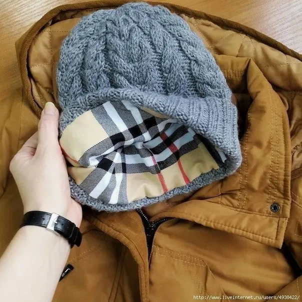 На согнутую в колене ногу натягиваю изнанкой вверх вязаную шапку, сверху натягиваю подкладочную шапку (фото показывать не буду, стыдно))), но до края шапки оставляю около 1-2см (чтобы подклад не выглядывал из под шапки – см.фото). Далее подгибаю край подклада внутрь и прикалываю булавками/иголочками. Если подклад толстый, например, толстый флис, то подгиб делать не надо, иначе у вас вязаная шапка будет отставать от головы как горшок. Таким образом получается равномерно распределить подклад по шапке, т.к. (обратите внимание!!!) подклад имеет бОльшую окружность, чем вязаная шапка, из-за разной эластичности материалов. Далее пришиваю потайным швом тонкий подклад за подгиб, и обычным швом через край, если используется толстый флис. Можно изначально прихватить стежками макушку и по затылку (вдоль единственного длинного шва на подкладе). Успехов!)))