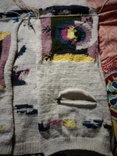 За ночь успела много сделать.Почти довязаны полочки и видны рисунки.