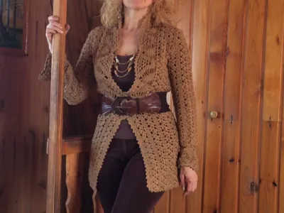 Кардиган крючком цвета охры.