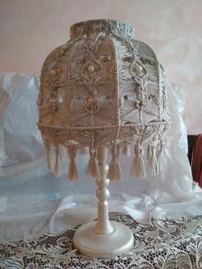 Очень интересно получилось. Вот за макраме я еще никогда не бралась. Возможно все еще впереди. А вот лампу настольную создать мне довелось. Идею предложил муж, посмотрев на бутылку из-под шампанского, которую я оформила в технике декупаж. Хотелось абажур связать, но не нашла каркаса, поэтому купила готовый, а всю электрику сделал муж.