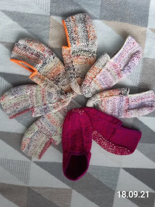 Быстро вяжутся , если есть настроение , но ещё быстрее разлетаются по другим домам . Нитки - все , что есть смешиваю : шерсть , акрил , полиакрил до нужной мне толщины и вяжу , спицы 2.5 , иногда 3