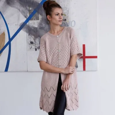 Пряжа (53% хлопка, 33% вискозы, 14% льна; 50 г/110 м) — 13 (15) мотков пудрово-розового цвета; прямые спицы № 3,5 и 4; круговые спицы № 3,5 длиной 80 см; 5 пуговиц диаметром 20 мм.