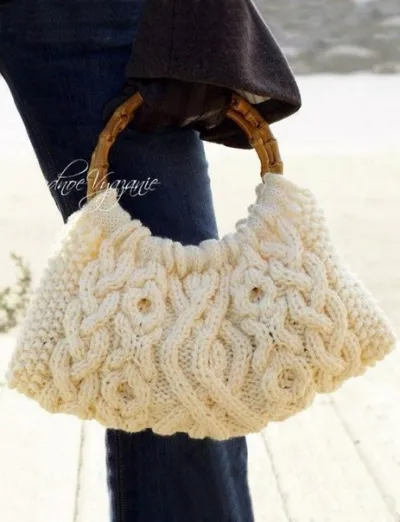 Сумка вязанная спицами Cabled Bag (Sac à Torsades) от дизайнера Patons.Модель связаны толстыми нитками красивыми аранами и жгутами,ручки лучше всего брать круглые,никакие другие не смотрятся столь гармонично.