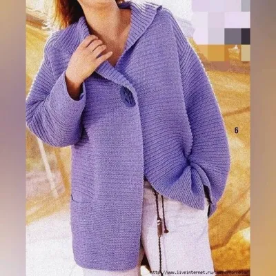 На спицы набрать 60 (67) 74 п. + 2 кром. п. Связать 20 см платочной вязкой. Затем вязать основным узором, при этом в 1-м р. закрыть для прорези кармана 27 п., начав с 11-й (15-й) 18-й п., довязать остальные петли.
