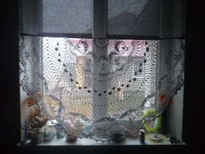Хотелось на даче все сделать своми руками. Связала тюль на кухонное окно и в зал.