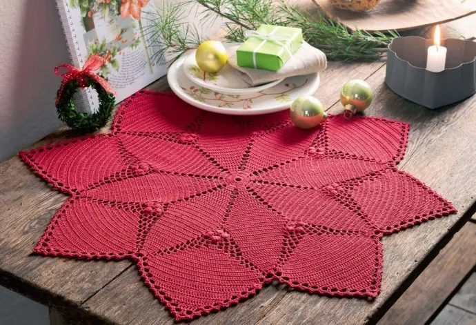 Салфетка в виде цветка пуансетии, который радует взгляд каждую зиму, оживит интерьер вашего дома. Если же вы хотите связать «всесезонную» модель, то можете просто выбрать другой цвет.