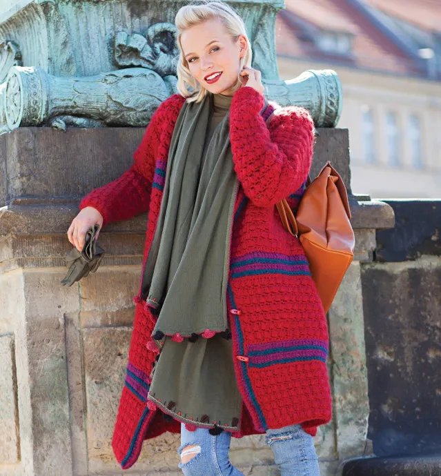 СБОРКА Выполнить швы, вшить рукава. Борта полочек и край горловины обвязать 1–3-м рядами узора из полос и закончить 1 рядом соед. ст. красной нитью. Пришить пуговицы к левой планке, при этом верхнюю пуговицу расположить у начала скоса выреза горловины, остальные – с интервалом 13 см. Пуговицы застегнуть через отверстия в узоре.