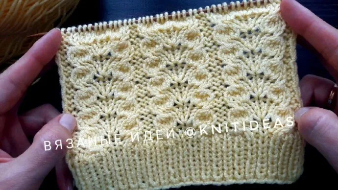 1 ряд: кром, *2 изн, 4 вм. лиц. за перед.стенку, из 1 п. вывязать 3 п. (лиц, накид, лиц)- повторить 3 раза, 4 вм. лиц. за заднюю стенку*, 2 изн, кром.