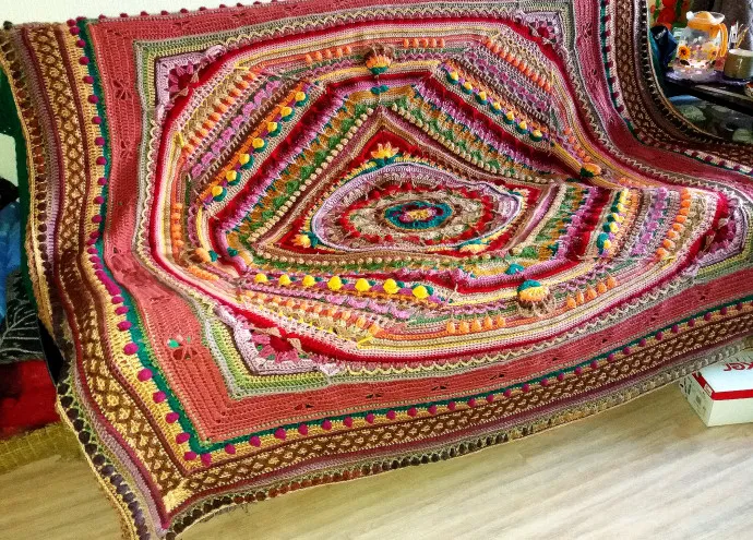Что-то восточное, очень красиво. У вас, наверное, большая скорость вязания, если такую махину связали всего за пару недель. Я бы вязала, наверно, полгода((