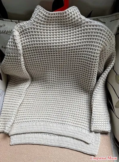 Этот модный свитер с удлиненной спинкой выполнен простым но эффектным плотным вафельным узором.