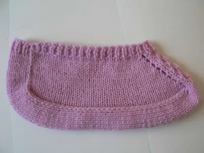 Вывязываем подошву на 13-ти центральных петлях. Провязываем 37 лицевых петель (считая кромочную), далее вяжем 12 петель лицевыми, 13-ю и 14-ю провязываем вместе. Поворачиваем работу на изнанку, вяжем 12 изнаночных петель, 13-ю и 14-ю провязываем вместе. И т.д... Т.е. вяжем, как пятку у носков.