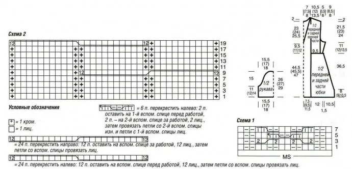 Спинка: набрать для юбки 146 (154) 162 п. и распределить их след. образом: кром., 4 п. жемчужного узора, 52 п. резинки А. 32 (40) 48 п. жемчужного узора. 52 п. резинки А, 4 п. жемчужного узора, кром. Через 8 см = 24 р. (9 см = 28 р.) 10,5 см = 32 р. от наборного края убавить для приталивания с обеих сторон в резинке А в общей сложности 10 п. Для этого в 5 дорожках из изн. глади провязать первые 2 п. вместе изн. = 136 (144) 152 п. Такие убавления выполнить еще 3 раза в каждом 24-м р. и 1 раз в след. 22-м р. = 96 (104) 112 п. Через 137 (141) 145 р. от наборного края прибавить с обеих сторон в след. изн. р. в резинке А по 6 п. след. образом: в 5 дорожках из лиц. глади (лиц. сторона дорожек из изн. глади) удвоить 2 раза среднюю петлю, 1 раз 1-ю и 3-ю п. и снова 2 раза среднюю петлю (= 1 лиц. и 1 лиц. скрещ. вывязать из поперечной нити) = по 33 п. резинки А или всего 108 (116) 124 п. Через 44,5 см = 138 р. (45.5 см = 142 р.) 47 см = 146 р. от наборного края петли для верхней части распределить след. образом: кром., 4 п. жемчужного узора. 33 п. плетеного узора, 32 (40) 48 п. жемчужного узора, 33 п. плетеного узора, 4 п. жемчужного узора, кром. Одновременно, начиная от конца юбки, прибавить с обеих сторон для боковых скосов 1 х 1 п. в след. лиц. р., затем 3 х 1 п. в каждом 6-м р. и 3 (4) 5 х 1 п. в каждом 4-м р. и вязать их жемчужным узором = 122 (132) 142 п. Через 11 см = 36 р. (12 см = 40 р.) 13,5 см = 44 р. от окончания юбки закрыть с обеих сторон для пройм 1 X 3 п., затем в каждом 2-м р. 1 х 2 и 6 (7) 8 х 1 п. = 100 (108) 116 п. Через 32,5 см = 108 р. (35 см = 116 р.) 37,5 см = 124 р. от окончания юбки закрыть с обеих сторон для скосов плеча 1 х 8 (10) 11 п., затем в каждом 2-м р. 1 x 9 (10) 10 и 2 x 9 (9) 10 п. Одновременно с 1-м убавлением для скосов плеча закрыть для выреза горловины средние 24 (26) 28 п. и обе стороны закончить раздельно.