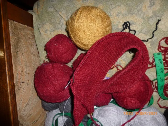 Нитки не новые, было платье, и то не моё, размера 46-48, не больше. И местами рваное, в общем в прошлом году его постирала и распустила. Нитки сами по себя - для машинной вязки в 5 сложений. А так как нитки сами по себе тёмные, и их мало, то решила такие нитки разбавить другим цветом! То есть по переду будет жакард)