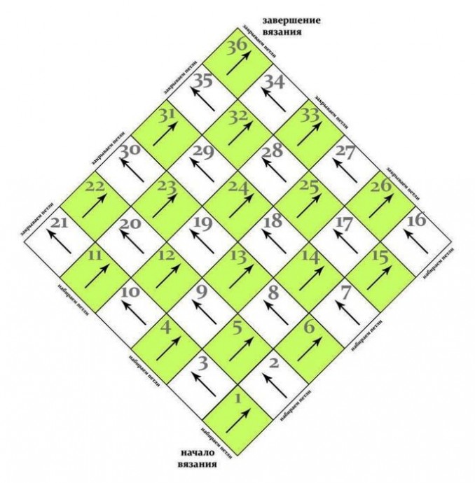 Я буду показывать все на пледе, связанном на 12 петлях, 6х6 квадратов, из пряжи Дундага 6.2, спицами №5 по следующей схеме: