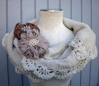 Вяжется этот шарф прямым полотнищем. Первую половинку вяжем платочной вязкой, а вторую половинку надо вязать квадратами из лицевых и изнаночных петель. Затем полотно соединяем в круг, а после обвязываем крючком верх и низ изделия. Можно красить цветочками и т. п.