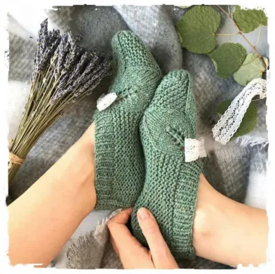 Продолжаем вязать подошву вверх, подцепляем кромочные петли по боковинкам (всего 18 раз) и провязываем по 2 петли вместе в конце ряда.Можно закончить пятку резинкой.Закрываем петли.