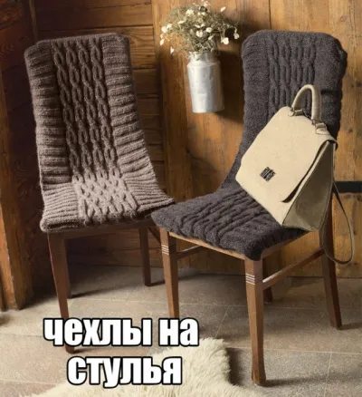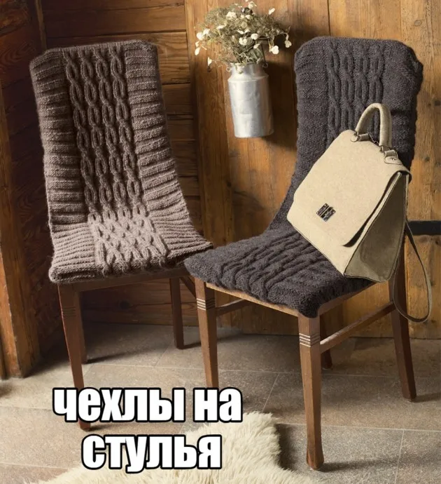 Пряжа (30% натуральной шерсти, 28% шерсти беби альпака, 22% полиамида, 20% шерсти яка; 110 м/50 г) — 200 г цв. дерева или темно-коричневой; спицы №6; 2 стула (ширина сиденья ок. 42 см, длина 40 см; высота спинки ок. 42 см).