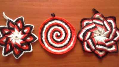 Работы, выполненные в 2017 году. Салфетки, прихватки, скатерти, цветы в горшке и другое.
