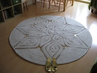 Малый коврик имеет диаметр 115 см, ушло 600-650 m хлопкового шнура 5 mm, крючок 9mm