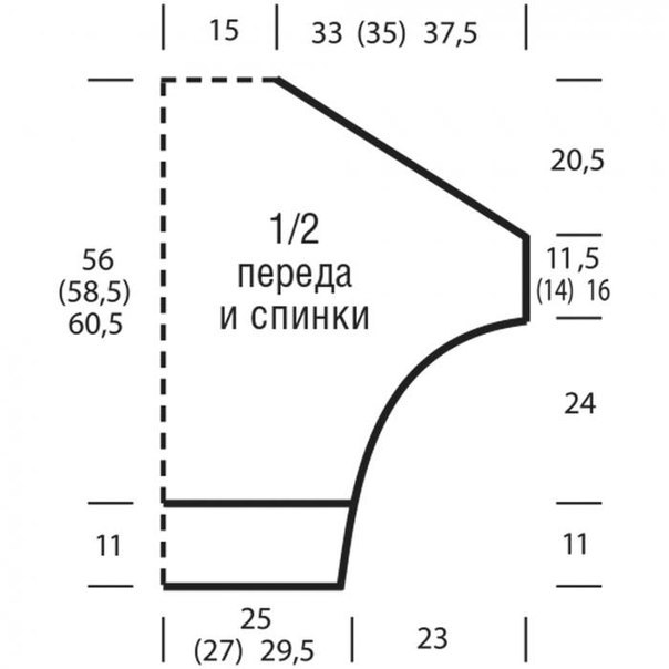 Спинка: на спицы №5 набрать 86 (92) 101 п. и для планки связать 11 см резинкой, при этом в последнем изнаночном ряду, равномерно распределив, прибавить 4 (6) 5 п. = 90 (98) 106 п. Продолжить работу на спицах №7 узором с протяжками. Одновременно для фасона «летучая мышь» прибавить или набрать с обеих сторон в каждом 2-м ряду от планки 5 x 1 п., 16 x 2 п. и 1 x 4 п. согл. узору и вязать узором с протяжками = 172 (180) 188 п. Через 35,5 = 66 рядов (38 см = 70 рядов) 40 см = 74 ряда от планки закрыть для плечевого скоса с обеих сторон 1 x 3 п., затем в каждом 2-м ряду закрыть 16 x 3 п. и 2 x 4 п. (12 x 3 п. и 6 x 4 п.) 8 x 3 п. и 10 x 4 п. Через 56 см = 104 ряда (58,5 см = 108 рядов) 60,5 см = 112 рядов от планки оставить оставшиеся 54 п.