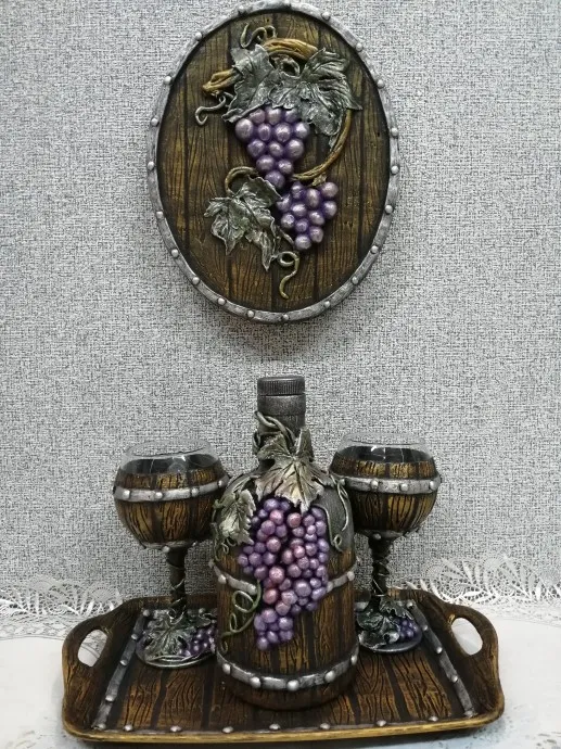 Здравствуйте, дорогие мастерицы. Делюсь свами подарочным набором, который я сделала для своих друзей. Эту идею хотела реализовать давно, но все руки не доходили. В интернете столько красивых бутылок с подобной тематикой, что глаза разбегаются, а от количества вариантов голова идет кругом. Моя подруга и ее муж коллекционируют вино в красивых емкостях. Иногда в праздники открывают бутылочку для себя или дорогих гостей. Вот так и родился этот комплект, только изначально я планировала просто красиво задекорировать только бутылку и заполнить ее хорошим коньяком, а потом подарить. В процессе работы в голове появилась идея добавить бокалы в таком стиле, потом поднос, а когда закончила и собралась дарить..... в моей голове нарисовалось панно и работа продолжилась. В итоге получился полноценный подарок, который станет достойным украшением винной коллекции моих друзей. Хочу сказать, что очень довольна результатом, получила незабываемое удовольствие от процесса. В конце поста, как обычно добавлю фото промежуточных этапов создания этого комплекта. Даже сейчас, когда уже создаю пост, в голову пришла идея с обратной стороны панно сделать памятную надпись с добрыми пожеланиями.