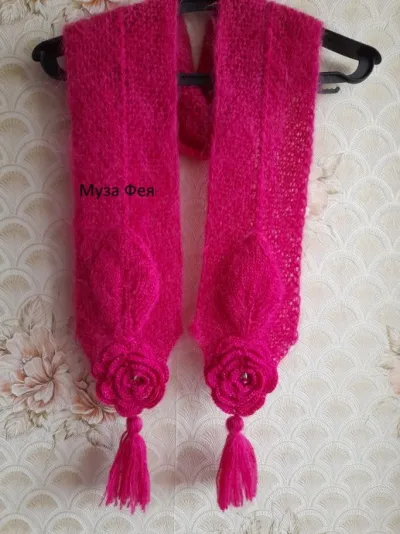 Розы связаны крючком, листья - спицами и пришиты сверху. Украшаем розы - в центр пришить страз или бусину, шарф - двумя кисточками.