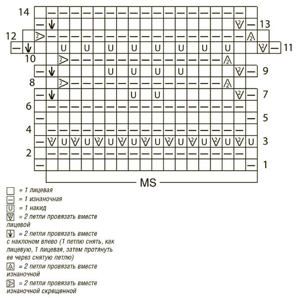 В лицевых рядах начать с 1 кромочной, раппорт постоянно повторять, закончить петлей после раппорта и 1 кромочной; в изнаночных рядах вязать наоборот. 1–14-й ряды постоянно повторять.