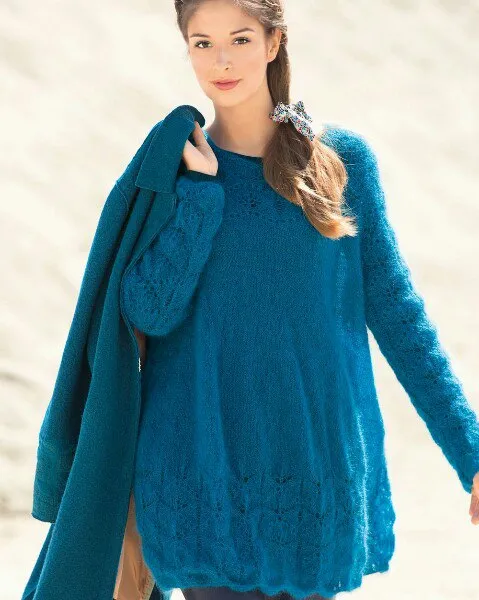 Почти невесомая туника, выполненная из пряжи с большим содержанием мохера и украшенная ажурным узором, станет украшением вашего гардероба и скроет возможные недостатки фигуры.