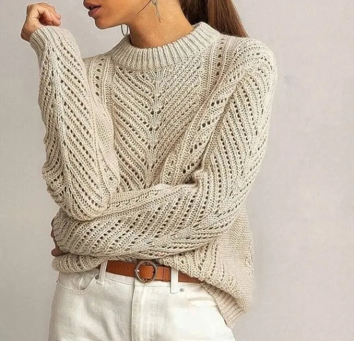 Красивый модный джемпер и тоже с ажурным узором. Связать можно из полушерсти и полухлопка (хлопка).