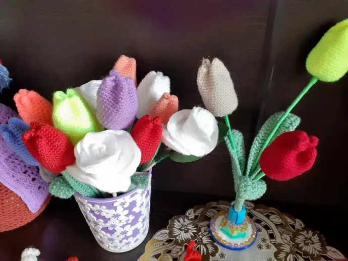 Вот уже второй букет тюльпанов связался, очень мне нравятся тюльпаны. Наверно поэтому их и вязала. Вяжутся они быстро и легко даже начинающий их свяжет. За вечер можно связать 5 -7 штук, потом сборка и все готово.
