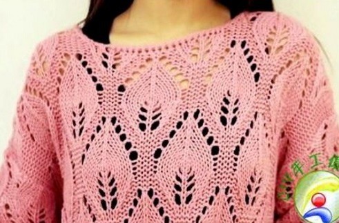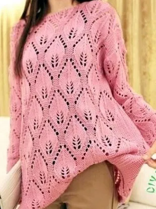Свободная туника, расширяющаяся к низу с крупным узором "листья" связана спицами. Туника связана из пряжи розового цвета.