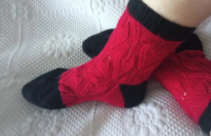 Всем рукодельницам добра и творческого вдохновения! Очередная утилизация пряжи. Увидела здесь на сайте носки «Флога» https://www.knittingideas.ru/posts/35418-noski-floga-spicami.html и не смогла не связать, очень понравился рисунок. Только ниточки красные и черные, супервош. Поэтому и всплыл в голове образ Кармен, как она сгорела в пламени любви. Спицы №2,5 и №2 -резинка.