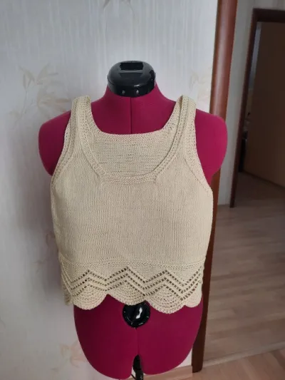 Извините, не могу топ показать надетым на манекен (его размер намного больше), а только приложила сверху.