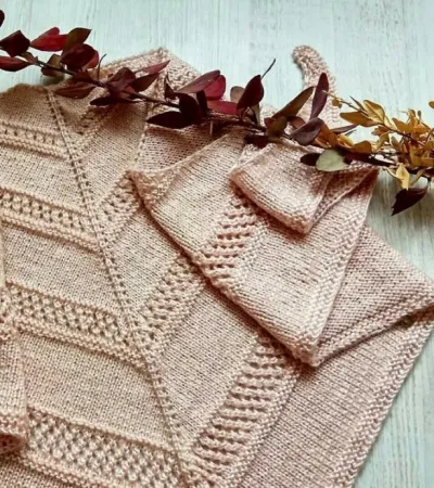 Например, 6-7 см лицевой глади, 6 рядов платочной вязки, снова лицевая гладь, затем ажур. Дырочки можно также отделять платочными рядамиЗаканчиваю бактус 6-8 рядов платочной вязки, как по вашему желанию.