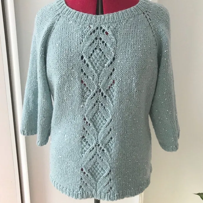Джемпер связан регланом сверху, основной узор — лицевая гладь. Ажурная вставка идёт только по центру джемпера спереди. Рукава три четверти.