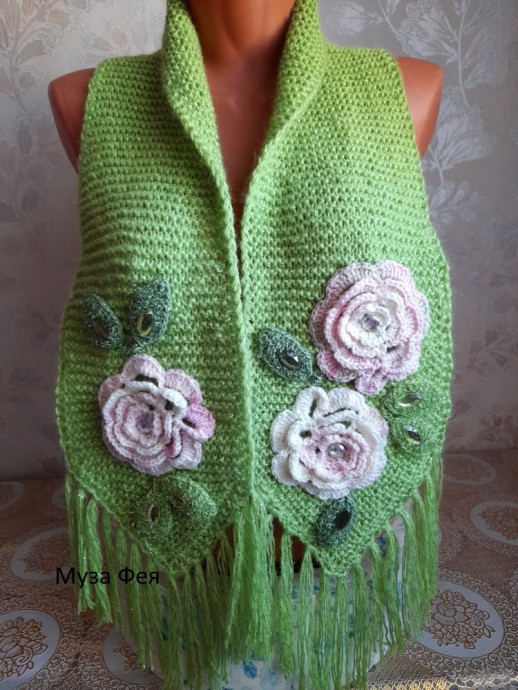 Связала шарфик из "Ализе симли" в две нити. Вес с цветами - 120г. Цветы связаны из секционной бело-розовой пряжи крючком. Листики - крючком из пряжи "Кристалл" двух оттенков. Аппликации украшены стразами и нашиты на шарфик сверху. Края шарфа оформлены в виде уголков. Начало - с 3 петель, прибавлять по бокам по 1 петле после и до кром. петли, в каждом лицевом ряду.