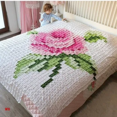 Вот такой замечательный плед связан из маленьких цветных квадратов, которые соединены по схеме вышивки. Потрясающе! Можно таким образом использовать и другие схемы.