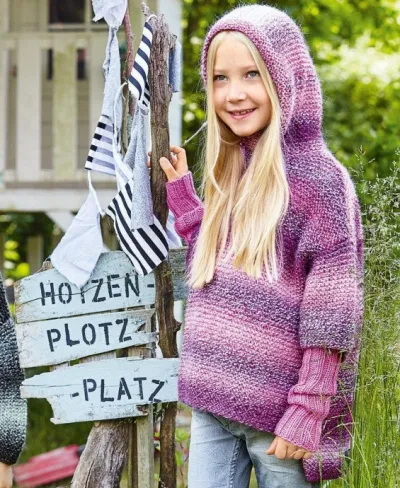 Для капюшона на круговые спицы №5 по краю выреза горловины набрать 52 (56) 56 п., при этом начать и закончить в середине переда. Вязать платочной вязкой рядами в прямом и обратном направлении, при этом в 1-м р. с обеих сторон прибавить по 1 п. = 54 (58) 58 п.