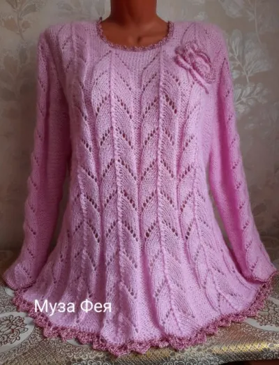 Низ пуловера - расклешенный, сужается к талии между ажурными полосами.