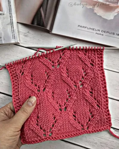 Изнаночные ряды и накиды вяжем изнаночными. Раппорт узора состоит из 14 петель + 1 петля для симметрии. В высоту повторять с 1 по 24 ряд.