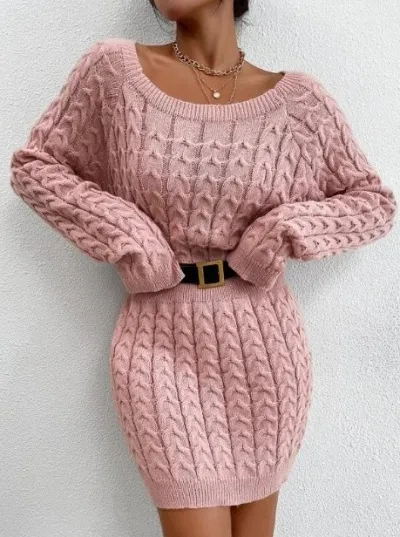 Розовое платье с "косами" и рукавом реглан, вяжем спицами