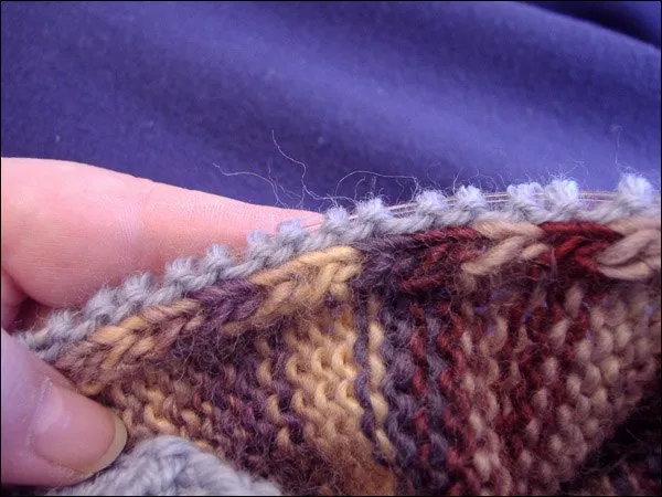 Провяжите 2-4 ряда и сделайте первое прибавление: в начале лицевого ряда снимите кромочную и, сделав накид (к себе), провяжите ряд, в конце его перед кромочной набросьте еще один накид.