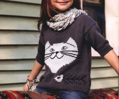 Перед: начать, как спинку, но в 1-м (5-м-9-м) р. от резинки после 28 п. от правого края вывязать светло-серой нитью мотив рыбьей головы. Через 6 (7,5-9) см = 16 (20-24) р. от резинки начать в центре вязать кошачью голову. Для выреза горловины закрыть на высоте 30 (34-38) см = 80 (92-104) р. от резинки или 3 (7-10) см = 10 (18-26) р. после рисунка кошачьей головы средние 18 (20-22) п. и сначала закончить левую сторону. Для закругления выреза выполнить с внутреннего края в каждом 2-м р. еще 4х 1 декоративную убавку. На высоте горловины 7 см = 20 р. закрыть оставшиеся 23 (26-29) п. Другую сторону закончить симметрично.