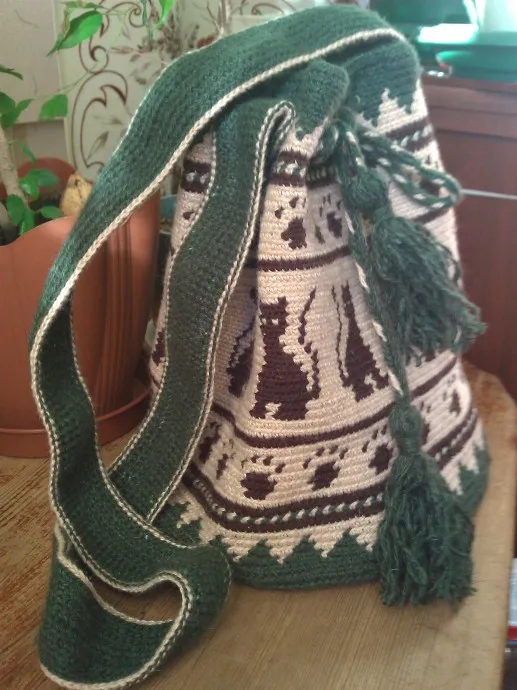 Сумка связана по мотивам сумок Wayuu Mochila ( Колумбия). За основу была взята идея. Рисунок "Кошки" - жаккардовый рисунок для вязания спицами, все остальное полет фантазии. Донышко вязалось без схемы, ка душа подскажет. Связана из пряжи шерсть и акрил (50% на 50%) , крючком № 2,5. Размер сумки: высота 28,5 см, диаметр донышка 25 см, длина ремня 112 см. Украшена кистями на шнуре. Шнур плетеный в ручную. (Способом: шнуры-дерганцы.) Шнур протягивается в отверстия, затем делаются кисти. С помощью шнура сумка закрывается, стягивая в симпатичные складочки. Вот такая довольно вместительная сумка -торба, сумка - мешок.